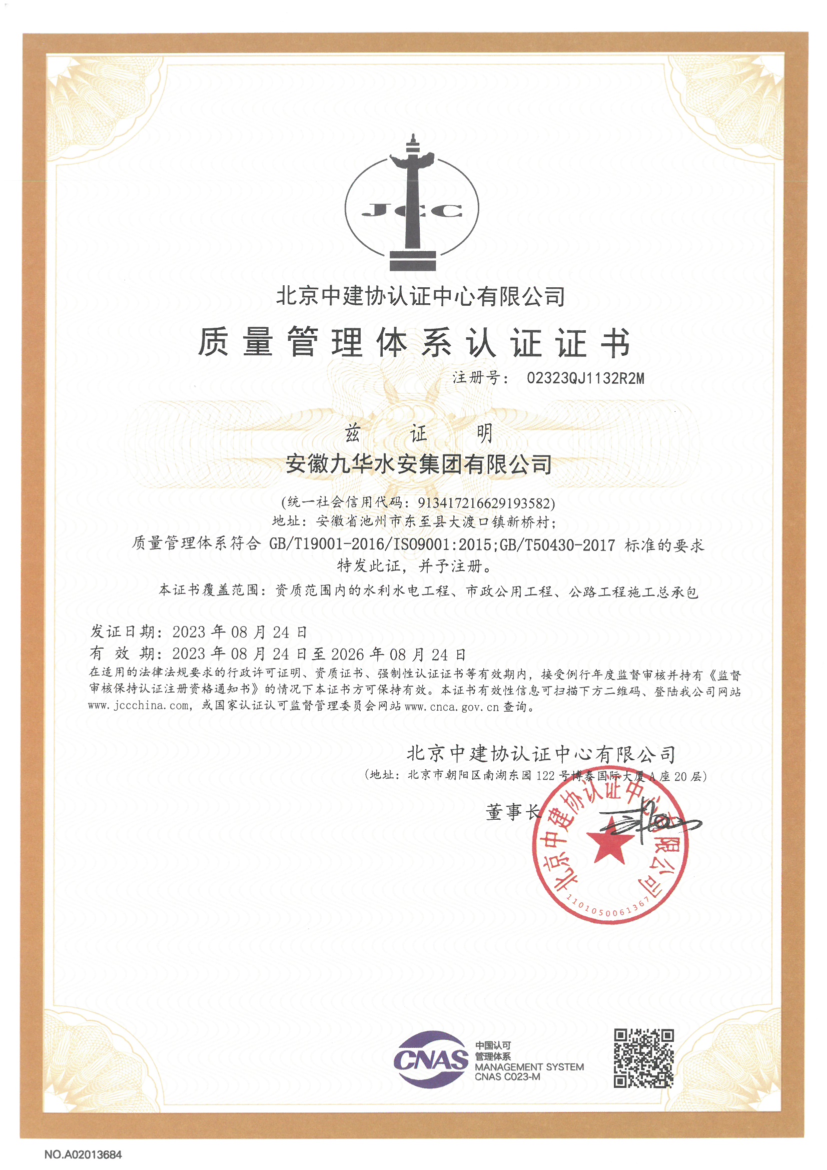 安徽九華水安集團座落在安徽省池州市大渡口經濟開發區。公司成立于2007年,是一家以水利水電工程施工為主,以建筑、公路、市政及環保工程施工為輔,集生態旅游、康養、農林漁業發展等為一體的綜合型民營企業。注冊資金3.6億元。 經過十余年的發展,公司目前擁有水利水電工程、市政公用工程、公路工程、建筑工程施工總承包貳級及環保工程施工專業承包貳級等資質?,F已成為水利部AAA級信用企業,且安徽省市場行為分值名列前茅,連續兩屆被公選為安徽省水利水電行業協會“副會長單位”,多次被評為“安徽省優秀建筑業企業”和“安徽省勞動保障誠信示范單位”。具有完善的綜合管理體系(ISO9001質量保證體系、ISO14001環境管理體系及GB/T45001職業健康安全管理體系)和科學合理的戰略發展規劃。 近期力爭成為省內行業最具品牌影響力企業、行業標桿之一 。 未來成為國內行業知名品牌、骨干企業之一。 為此我們將不懈努力......